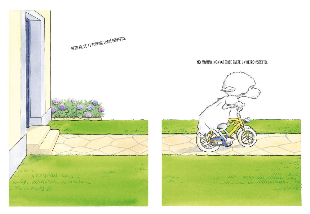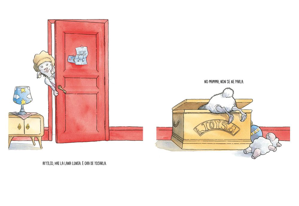 La mamma lo chiama e lo invita a tosarsi, ma lui preferisce giocare e dice che non gli va: si è affezionato a quella nuvola di lana che lo avvolge e lo fa sentire al sicuro.