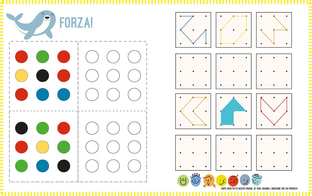 Attraverso il potenziamento della percezione degli elementi dati e della capacità di concentrazione, bambini e bambine impareranno a prendersi il proprio tempo nell’elaborare una strategia di compilazione e a trovare la propria strada nell’organizzazione spaziale.