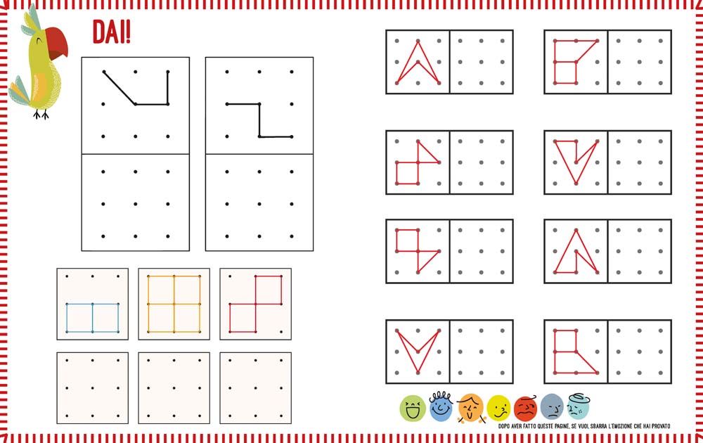 Questo non è il classico libro con i puntini numerati da collegare per comporre un’immagine. Gli esercizi proposti non sono né una semplice attività di svago né finalizzati al mero apprendimento della sequenza numerica, ma combinano l’allenamento al pregrafismo con lo sviluppo della coordinazione oculo manuale. Unire i puntini contribuisce a dar loro un ordine e a individuare legami tra elementi altrimenti isolati. Così, da schemi semplici e via via più complessi si arriva alla costruzione delle figure.
