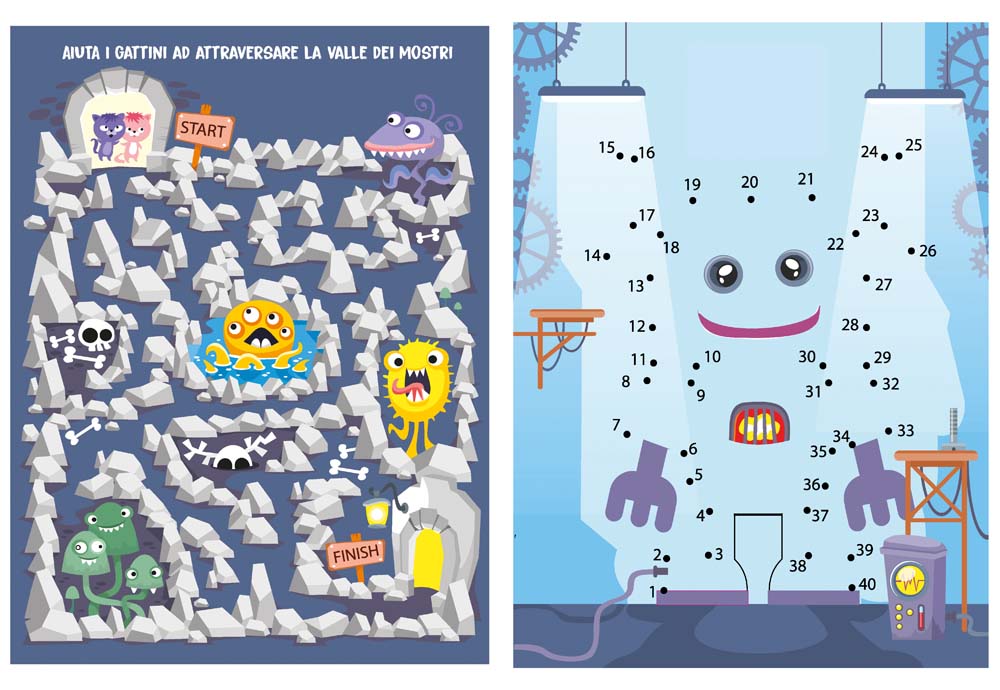 Intramontabili giochi come i labirinti, unisci i punti e trova le differenze tutti racchiusi in un libro per passare il tempo divertendosi.