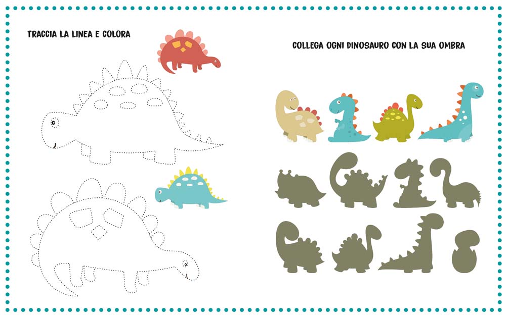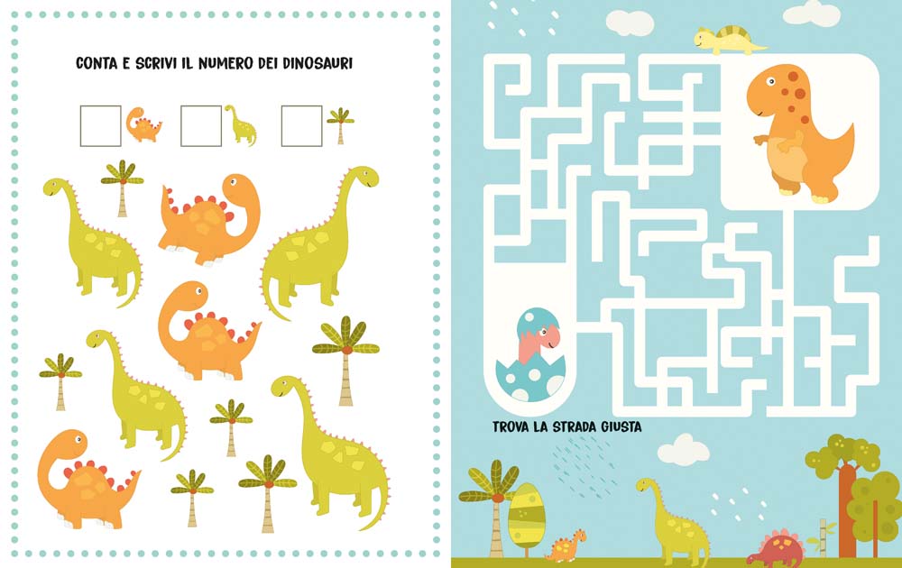 Un libro di giochi e passatempi insieme a tanti simpatici dinosauri che condurranno i bambini attraverso labirinti, unisci i puntini, trova le differenze e tutti quei giochi enigmistici intramontabili anche per le nuove generazioni.